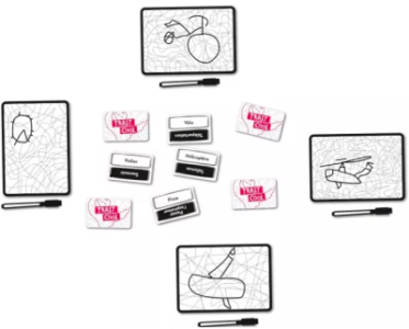 Ces contraintes transforment chaque croquis en casse-tête graphique ! Une fois les dessins terminés, toutes les cartes-mots sont mélangées avec des leurres et révélées. Ensemble, les joueurs éliminent les mots qui ne correspondent à aucun dessin.